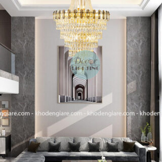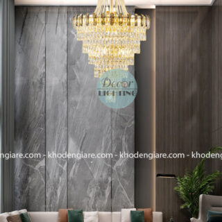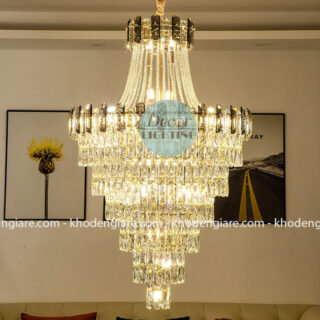 Thiết kế nhiều tầng xếp chồng, với từng dải pha lê rủ mềm mại phản chiếu ánh sáng lung linh, giúp căn phòng bừng sáng và tràn đầy khí chất. Mỗi chi tiết được gia công tỉ mỉ, từ độ cân đối của khung đèn đến độ trong suốt hoàn hảo của từng viên pha lê, tạo nên một tác phẩm nghệ thuật tinh xảo.