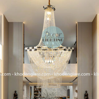 Đèn được thiết kế theo phong cách thông tầng sang trọng, lấy ý tưởng từ dòng thác pha lê rực rỡ đổ xuống. Từng chuỗi pha lê trong suốt được cắt mài tỉ mỉ, sắp xếp thành nhiều tầng uyển chuyển, tạo hiệu ứng chuyển động mềm mại khi ánh sáng chiếu qua.