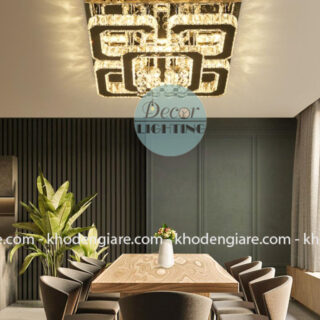 Đèn mang thiết kế vuông vắn hiện đại, được cấu tạo từ khung inox sáng bóng kết hợp cùng pha lê cao cấp nhiều tầng. Các hạt pha lê được xếp lớp tinh tế, tạo nên hiệu ứng chiều sâu và ánh sáng lung linh như dải tinh thể rực rỡ. Kiểu dáng vừa sang trọng – thanh lịch, vừa mang tính nghệ thuật giúp trần nhà trở thành điểm nhấn nổi bật.