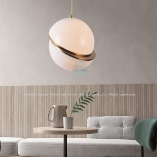 Chiếc đèn thả trần thủy tinh nhập khẩu chính hãng từ nước ngoài được làm từ sắt không gỉ và nhựa acrylic trắng hiện đại, có độ bền cao, có khả năng cắt gọt tốt. Dưới đôi bàn tay khéo léo của người thợ thủ công, sản phẩm đã có kiểu dáng hình tròn bị lệch độc đáo, phần bị lêch được mạ vàng sáng bóng kết hợp với sắc trắng của nhựa acrylic khiến mọi người liên tưởng đến hình ảnh quả trứng gà luộc, thành công tạo điểm nhấn tuyệt vời cho không gian sống.