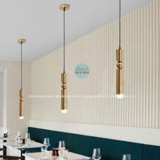 Đèn thả DC336G được thiết kế dạng hình ống dài với điểm nhấn là các khớp cầu kim loại tạo cảm giác phá cách và nghệ thuật. Màu vàng ánh kim nổi bật mang lại sự sang trọng, quý phái nhưng không hề phô trương. Dây treo linh hoạt giúp dễ dàng điều chỉnh độ cao phù hợp với từng không gian.