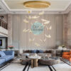 Đèn sử dụng hệ thống bóng LED cao cấp, phát ra ánh sáng vàng ấm áp, tạo cảm giác sang trọng và gần gũi. Khi ánh sáng lan tỏa qua các thanh pha lê trong suốt, từng tia sáng được khúc xạ và phản chiếu lung linh, tựa như những giọt nước vàng óng rơi từ thác trời. Sắc vàng nhẹ nhàng làm nổi bật màu mạ vàng của cụm hoa, đồng thời tôn lên vẻ rực rỡ của không gian. Ánh sáng vừa đủ rực để tạo điểm nhấn, vừa đủ êm dịu để mang lại cảm giác thư thái và ấm cúng. Đây là loại ánh sáng lý tưởng cho những không gian sang trọng, cần sự nổi bật mà vẫn tinh tế.