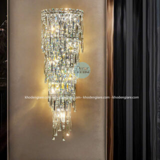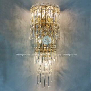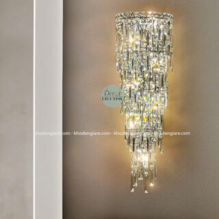 Chiếc đèn tường pha lê này được thiết kế theo phong cách hiện đại kết hợp cổ điển, tạo nên một tổng thể tinh tế, sang trọng và đẳng cấp. Đèn nổi bật với cấu trúc xếp tầng độc đáo – các thanh pha lê cao cấp được cắt vát tỉ mỉ, thả rũ mềm mại từ trên xuống như một dòng thác ánh sáng, tạo hiệu ứng lung linh, huyền ảo khi đèn được bật sáng.