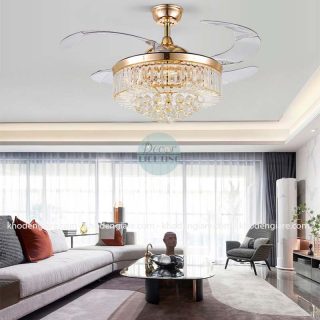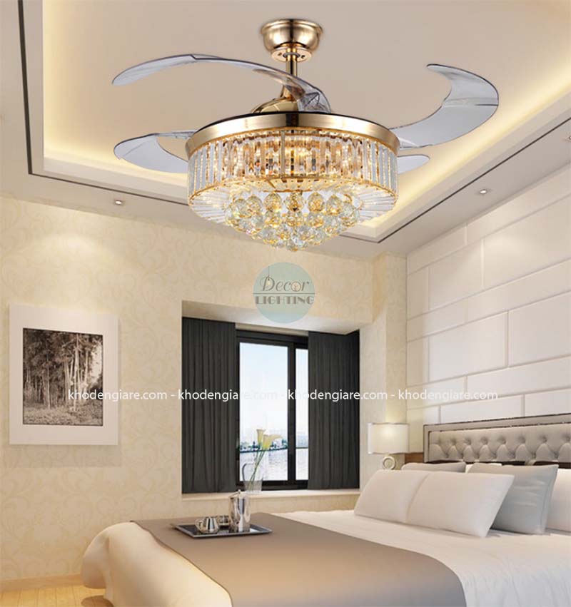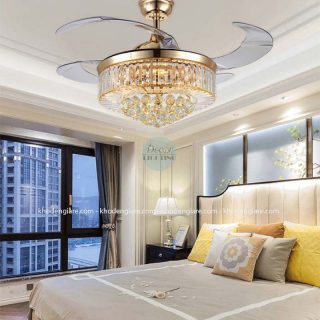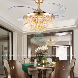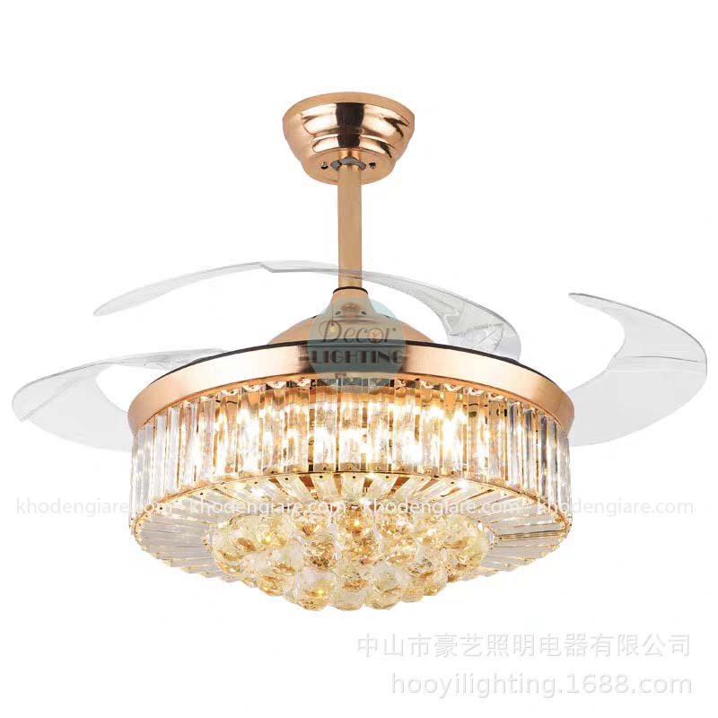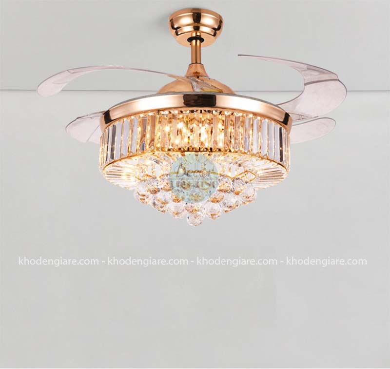 Nếu được bình chọn quạt trần đèn xòe cụp giá rẻ đẹp nhất khó có loại quạt trần đèn nào vượt qua được quạt trần cánh cụp xoè trang trí nhà DC9026. Sản phẩm có thiết kế tương tự như 1 chiếc đèn chùm, bao quanh bên ngoài chụp đèn là những viên pha lê lấp lánh.